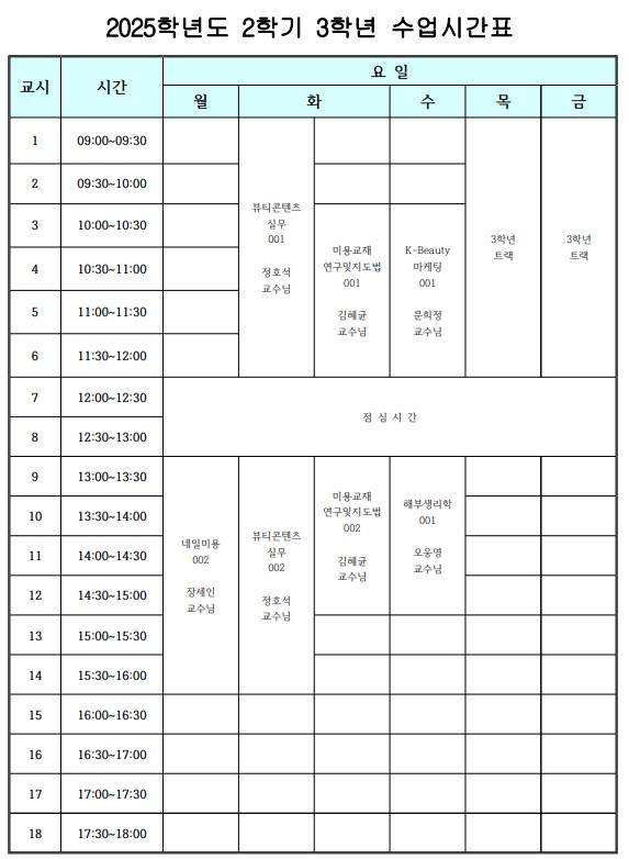 강의자료실 강의시간표 강의자료 강의시간표Home강의자료실강의시간표 1학년 2학년 3학년 4학년 2025학년도 2학기 3학년 강의시간표 작성자 : 학과관리자 | 작성일 : 2025.09.11 | 조회수 : 20 첨부파일 2025학년도 2학기 3학년 강의시간표.jpg 목록 이전글 이전 글이 없습니다. 다음글 다음 글이 없습니다.