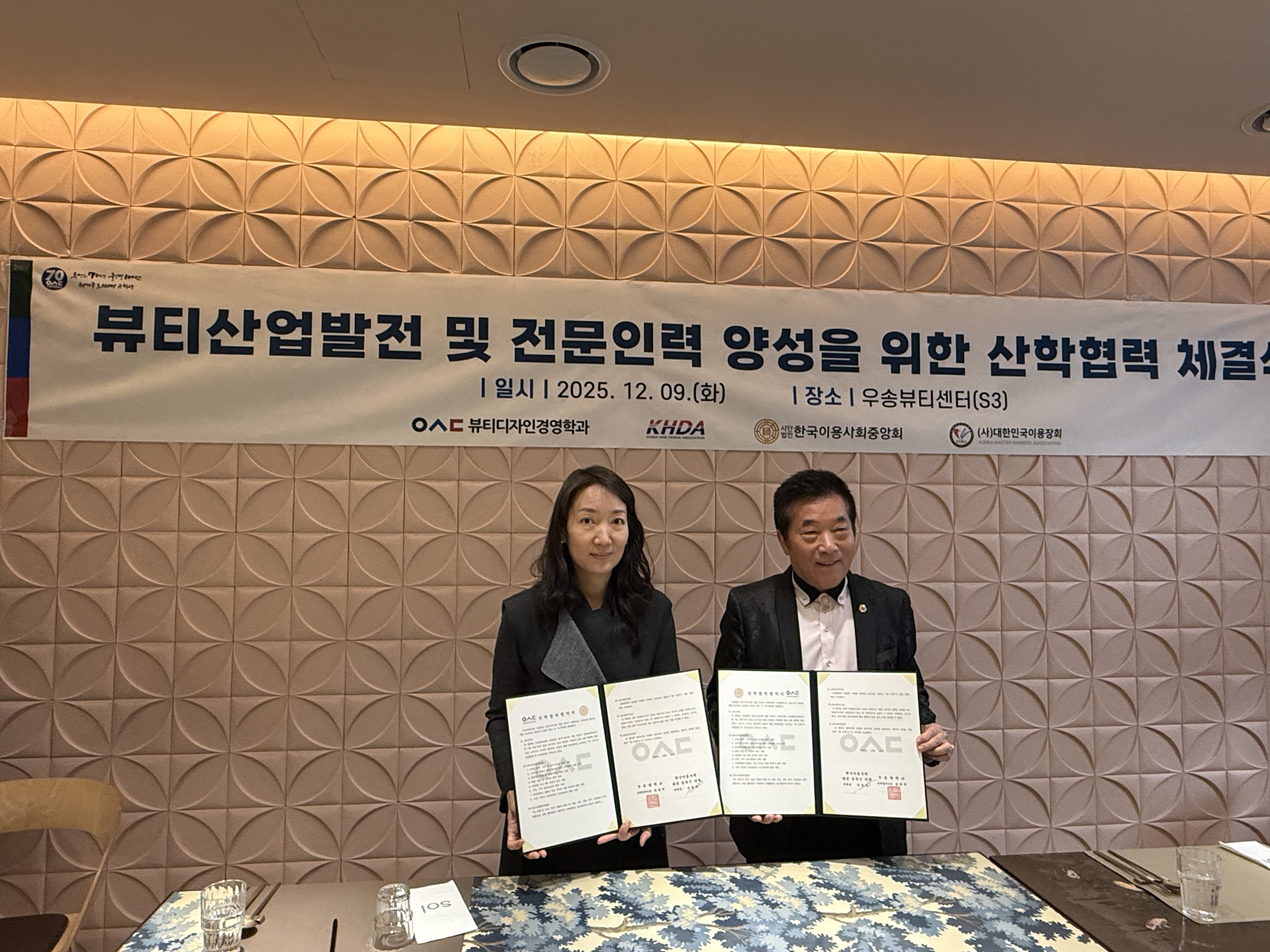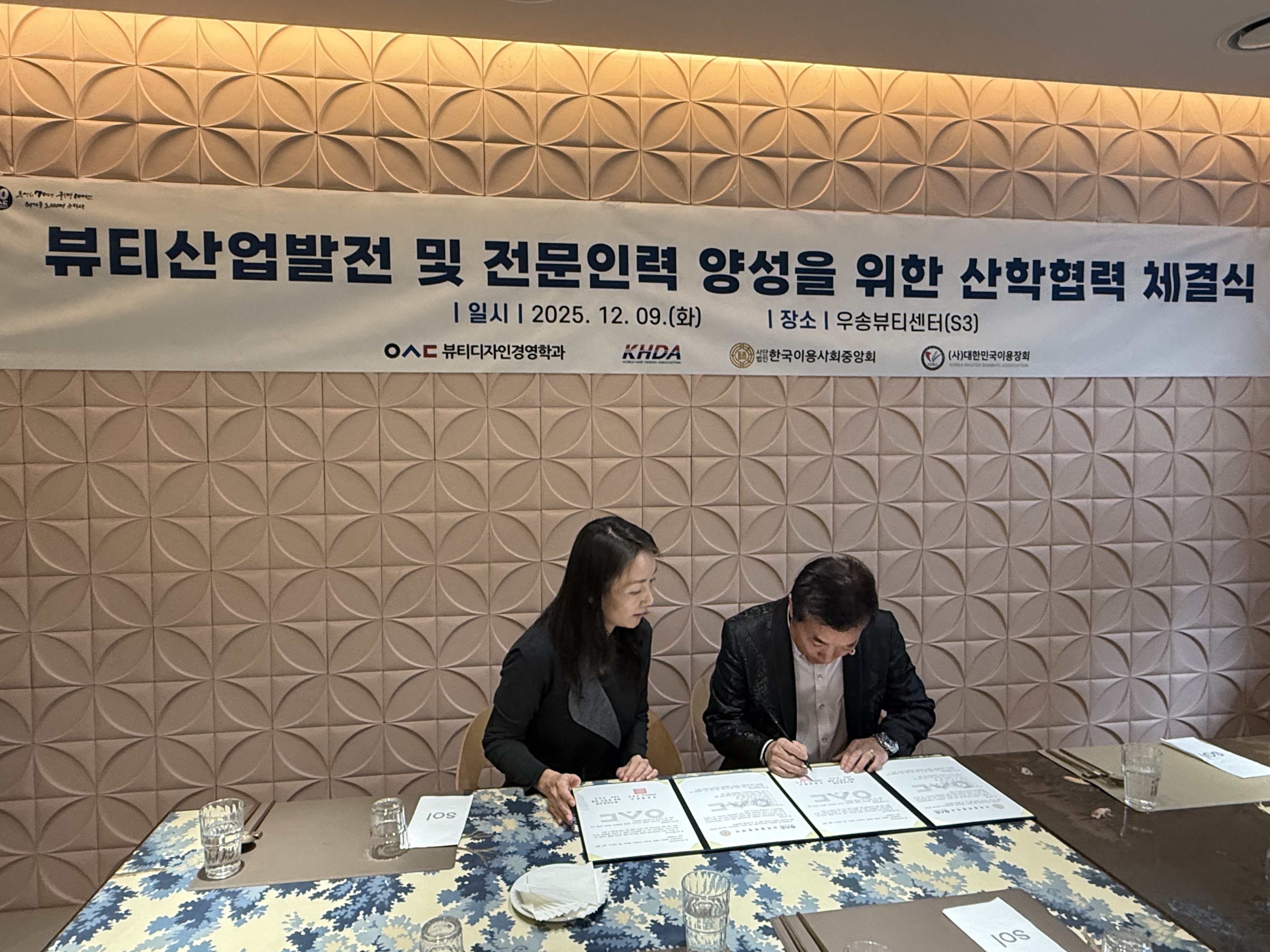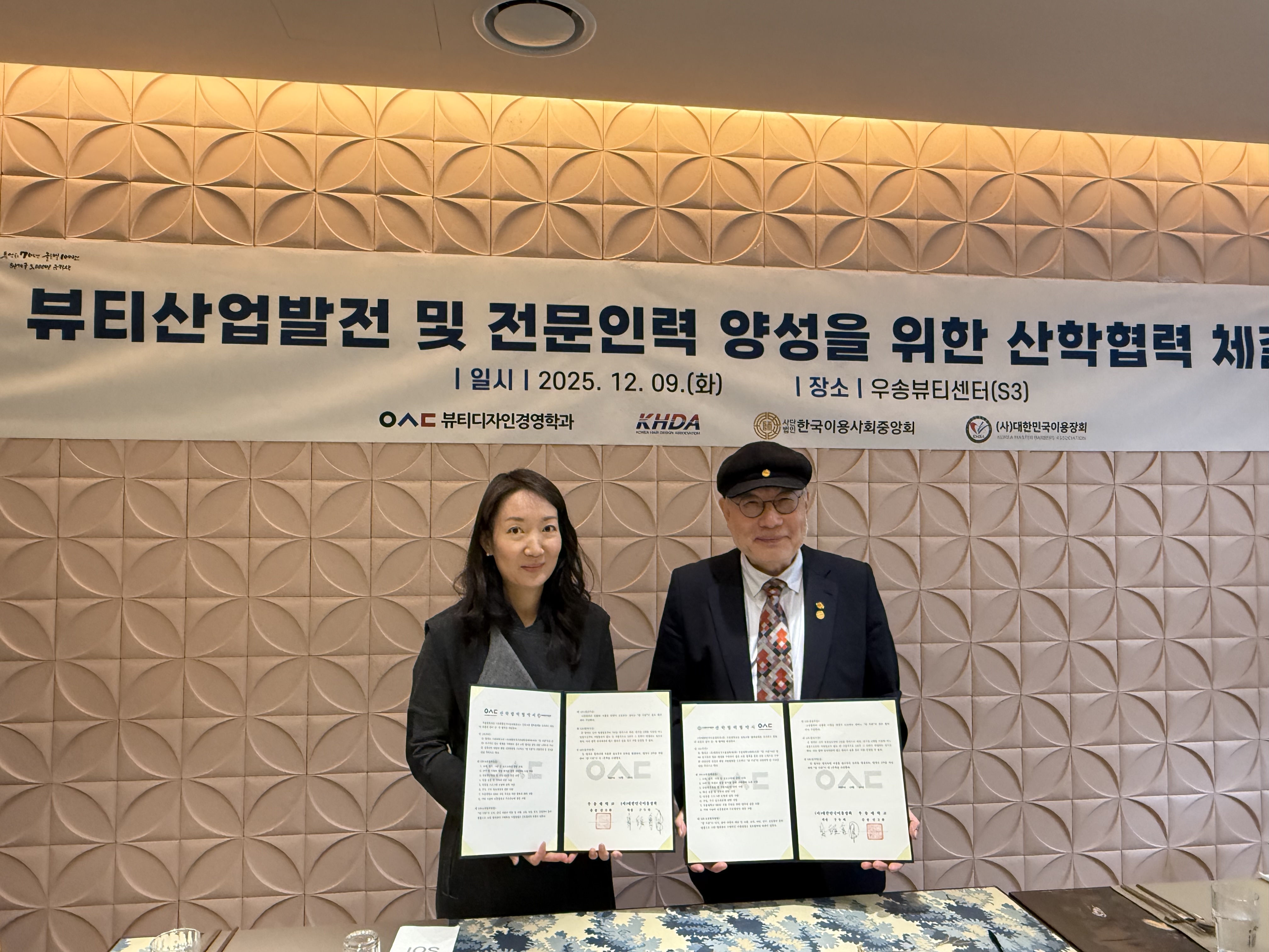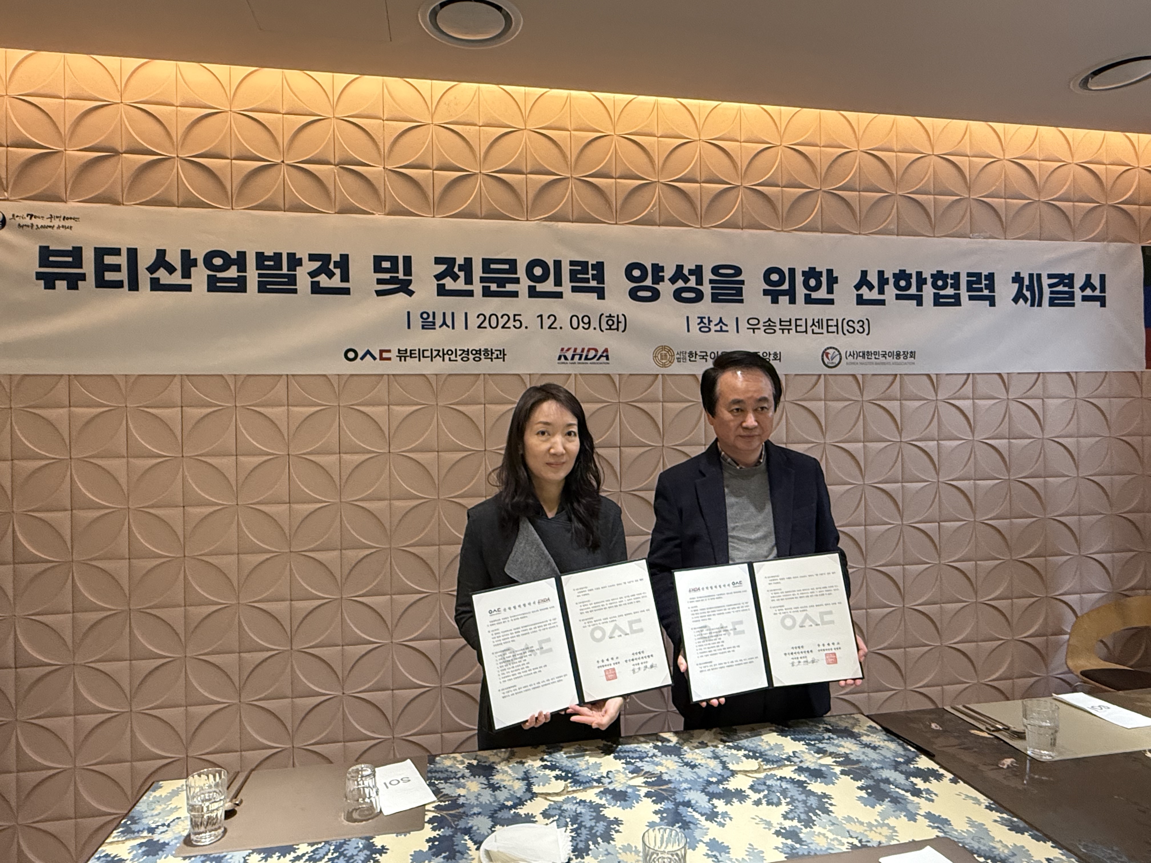 커뮤니티 공지사항 게시판 포토갤러리 학과뉴스 학과 행사 학술동아리 고교 원클래스 K-MOOC 최고경영자과정 유학정보 포토갤러리Home커뮤니티포토갤러리 세미나&특강 SHOW 대회수상 동아리활동 MT&기타 2025년도 뷰티디자인경영학과 사단법인한국헤어디자인협회, 사단법인 한국이용사회 대전 동북구 지회, 사단법인 대한민국 이용장회와 MOU 협약 카테고리 : [기타]| 작성자 : 학과관리자 | 작성일 : 2025.12.09 | 조회수 : 13 우송대학교 뷰티디자인경영학과에서는 사단법인한국헤어디자인협회, 사단법인 한국이용사회 대전 동북구 지회, 사단법인 대한민국 이용장회와 산학협력 협약식과뷰티디자인경영학과의 향후 방향성과 발전방안에 대한 토의를 진행하였습니다.이를 통해 학생들이 지속적으로 다양한 미용분야에 대해서 공부하고 현장 실습 및 인턴쉽 과정의 기회 확대로 더 나은 취업의 길로 우송대학교 뷰티디자인경영학과가 인도할 수 있기를 희망합니다 첨부파일 KakaoTalk_20251209_115517022_11.jpg KakaoTalk_20251209_115500312_15.jpg KakaoTalk_20251209_115517022_07.jpg KakaoTalk_20251209_115500312_24.jpg KakaoTalk_20251209_115500312_14.jpg 목록